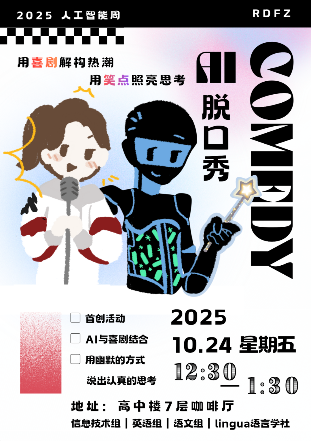 AI遇见脱口秀,一场别开生面的思想碰撞就此展开。AI主题脱口秀旨在打造一个轻松、开放的交流平台,鼓励学生以独特的视角、幽默的语言,分享自己对AI时代的观察、思考与奇思妙想。这里是展现附中学子批判性思维、创新表达与综合素养的闪亮舞台,让智慧在欢笑中激荡。