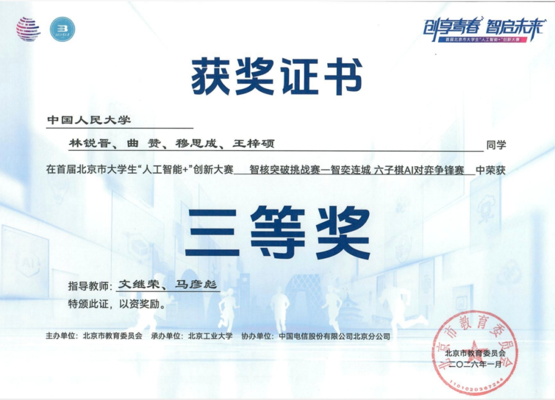 近日,北京市大学生“人工智能+”创新大赛参赛获奖结果公布,中国人民大学高瓴人工智能学院2025级本科生(大一)组建的两支队伍,在学院文继荣院长、曹朝教授、马彦彪老师和两位研究生的指导下,凭借扎实的专业功底和出色的算法设计,从众多高校参赛队伍中脱颖而出,分别斩获北京市大学生“人工智能+”创新大赛的六子棋项目赛道一等奖和三等奖。其中,由王晨好、白雨格、郑好、邵思涵组成的“请输入文本”队获得一等奖,由林锐晋、王梓硕、穆思成(金融数学专业)、曲赞组成的“咪咪”队获得三等奖。