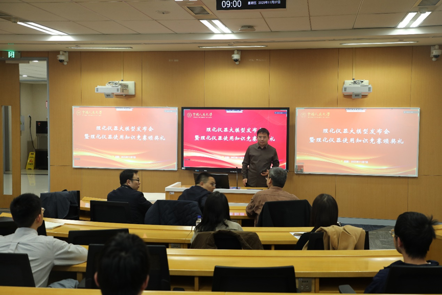11月7日9:00,立德楼703,“理化仪器大模型发布会暨理化仪器使用知识竞赛颁奖礼”准时开始。上半场由化学与生命资源学院副院长慕成主持。