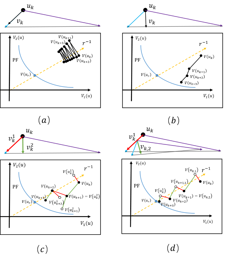 切比雪夫函数是一个非光滑函数,使用传统的次梯度方法寻找EPOS通常会出现震荡现象从而导致收敛速度变慢。传统的多重梯度下降算法(MGDA)是一种多目标优化方法,它可以同时优化所有目标从而收敛到Pareto稳定解。但由于缺乏考虑用户偏好,无法收敛到EPOS。与之相对地,本研究提出的两种算法可以实现快速且精准地收敛到EPOS(图2),这更加符合实际应用中的跟踪控制需求。