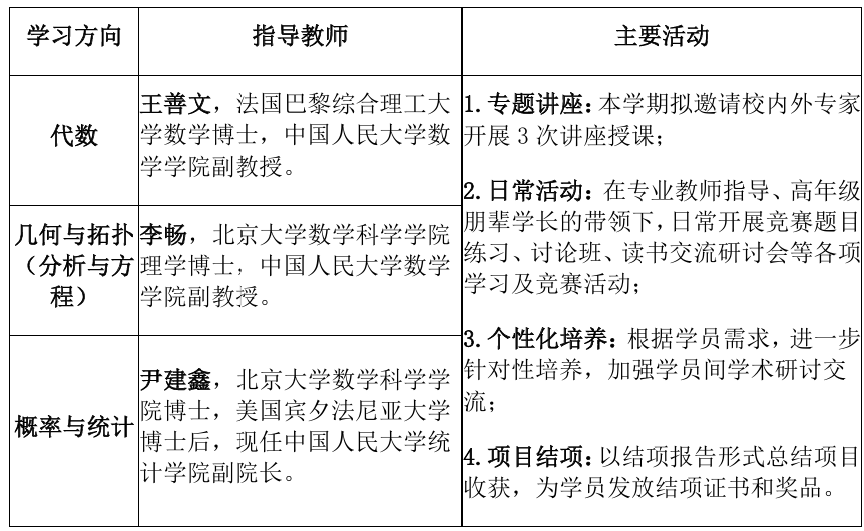 代数、几何与拓扑(含分析与方程)、概率与统计3个方向,每个方向招收10人左右,其中数学、信息、统计相关专业同学优先,跨专业申请者需具备一定数学基础(如修读过高等数学、线性代数等核心课程),欢迎其他同学报名参加。