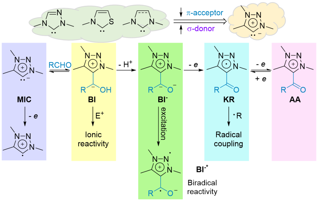 近年来闫晓宇课题组和Bertrand课题组的系列工作表明,介离子卡宾(Mesoionic Carbenes, MICs)作为一类新型卡宾催化剂,具有多种反应模式,如离子型、自由基型和双自由基型的反应路径,从而可以发生多种新型化学转化,展现出替代传统过渡金属催化剂的巨大潜力。