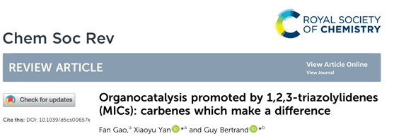 近日,中国人民大学化学与生命资源学院闫晓宇副教授与美国加州大学圣迭戈分校Guy Bertrand教授在《Chemical Society Reviews》上发表题为“Organocatalysis Promoted by 1,2,3-Triazolylidenes (MICs): Carbenes which Make a Difference”的重要综述论文,系统总结了介离子卡宾(MICs)在有机催化中的独特优势与应用进展。