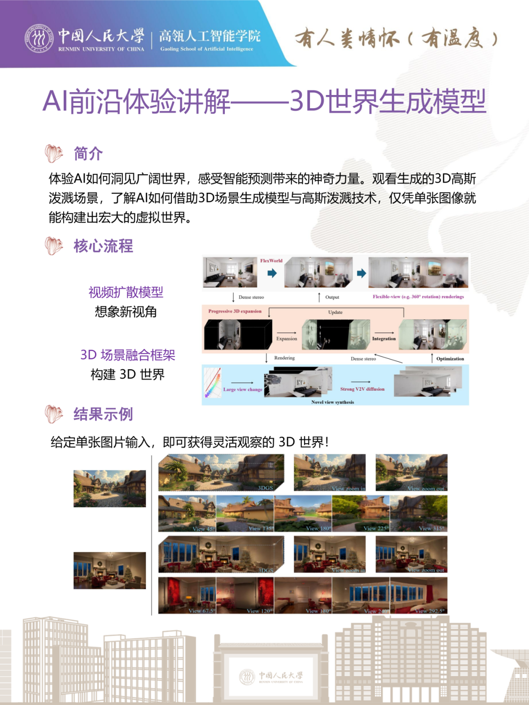 李崇轩副教授课题组的陈路晰向同学们展示了“3D世界生成模型FlexWorld”。FlexWorld是一种从单张图像生成3D高斯泼溅的方法,旨在解决2D到3D生成的固有歧义性,尤其是大视角(超180°)下的遮挡重建难题,对考古、导航等难以获取3D数据的领域具有积极意义。