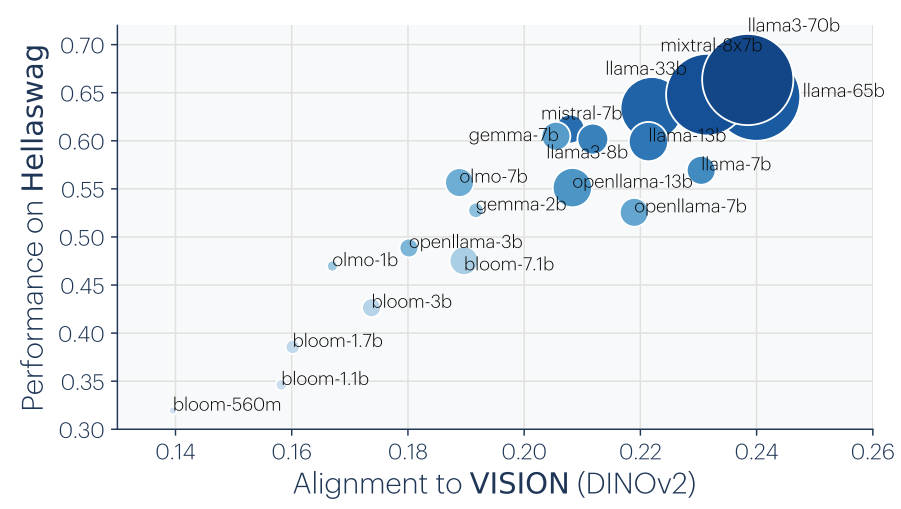 图3 横轴为语言模型的性能(1 - bits-per-byte),纵轴为与不同视觉模型的对齐分数。更强大的语言模型与更强大的视觉模型之间的对齐度更高,且呈现出清晰的线性趋势。