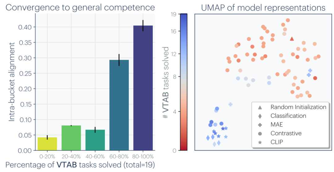 图2 (左):在VTAB多任务迁移基准上能解决更多任务的模型,彼此之间的表征对齐度更高。(右):将78个模型嵌入二维空间可视化。能力越强的模型(蓝色)聚集越紧密,弱模型(红色)则各有各的"弱法"。