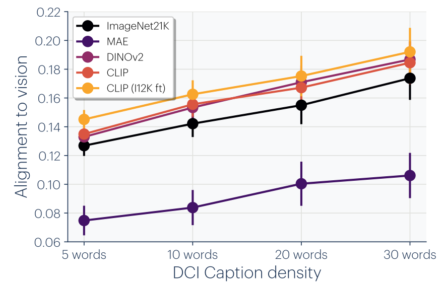 图9使用不同密度的图像描述测量跨模态对齐。描述越详细(信息量越大),语言-视觉对齐度越高—表明信息损失是跨模态收敛的主要瓶颈之一。
