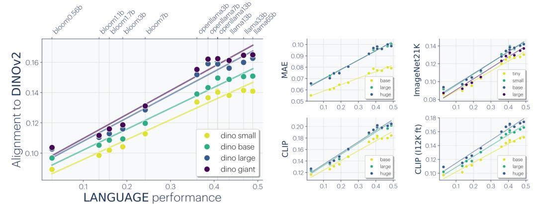 实验结果显示,跨模态对齐的程度与两边模型的能力均呈正相关,并且表现出清晰的线性趋势:更强大的语言模型与更强大的视觉模型之间的对齐度更高(图3)。这意味着语言和视觉这两条独立的优化路径,正在自发地走向同一个表征目标。