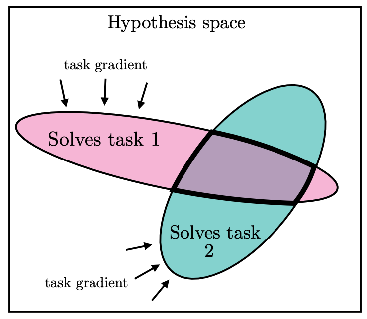 为什么要求模型解决更多任务会推动收敛?直觉上,每一个新的训练任务都是对模型表征的一个额外约束。随着需要同时满足的任务数量增加,能够满足所有约束的表征空间会越来越小(图5)。互联网规模的数据意味着海量约束——满足所有约束的表征集合必然非常狭小。
