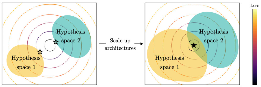 图6 (左)两个小模型的假设空间可能不包含最优解,因此找到不同的解。(右)当模型变大时,假设空间覆盖最优解,两个模型收敛到同一解。
