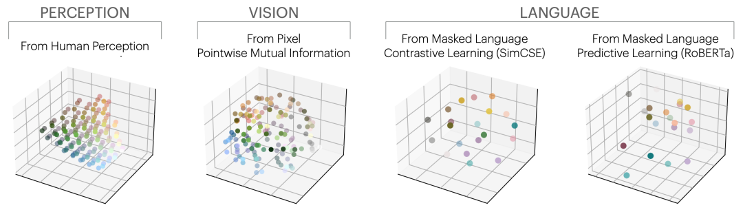 图8 从左到右依次为——CIELAB感知色彩空间、CIFAR-10图像中的像素共现统计学习到的颜色表征、以及语言模型(SimCSE和RoBERTa)学到的颜色表征。视觉共现和语言共现竟然恢复了几乎相同的感知色彩结构。