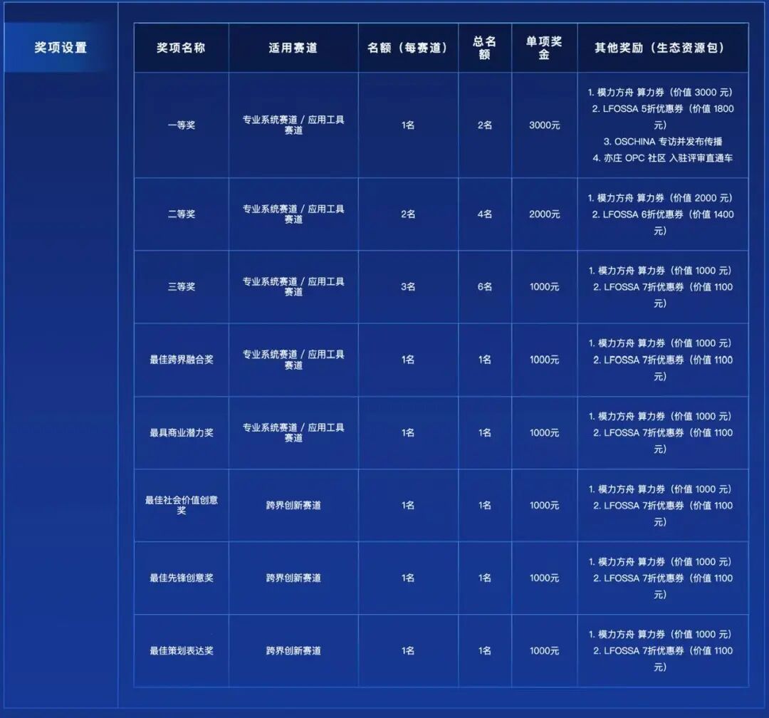 在专业系统赛道与应用工具赛道中,大赛设置了一等奖、二等奖与三等奖,分别提供3000元、2000元与1000元的现金奖励,并按照赛道分别评选,总计覆盖多个获奖名额。
