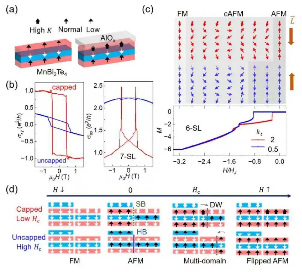 图: (a)器件结构示意图。(b)氧化铝提升MnBi2Te4表面磁各向异性,增强量子反常霍尔效应。(c)理论计算表明表面磁性提高与降低,会在偶数层产生相反的奈尔序。(d) MnBi2Te4中奇偶边界导致的不同畴行为。