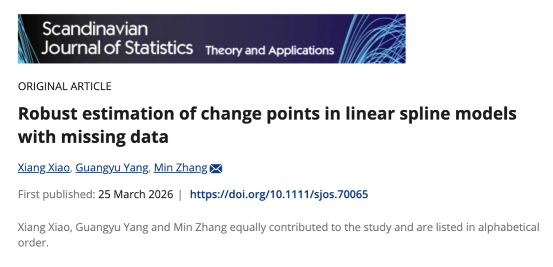 中国人民大学统计与大数据研究院2022级博士研究生肖翔的论文“Robust Estimation of Change Points in Linear Spline Models with Missing Data”已被国际统计学期刊Scandinavian Journal of Statistics接收发表。该论文由肖翔在导师杨光宇助理教授、清华大学张敏教授共同指导下完成,此前还在“2025 年统计学及相关学科发展研讨会暨博士研究生学术论坛” 中斩获一等奖。