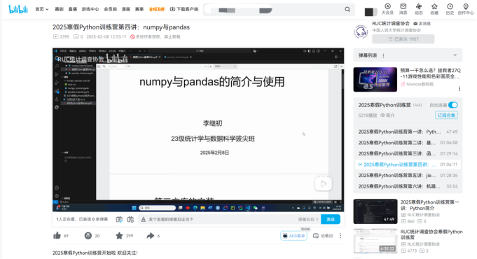 在大二学年,我担任了统计调查协会的负责人,这段经历让我记忆犹新。在一学年中,我参与“百团大战”招新、策划小调查大世界比赛、并在寒假的时候策划组织了Python训练营,在bilibili直播为新生教学Python编程。