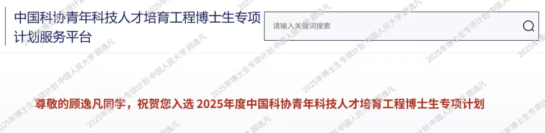 中国科协发布了2025年度中国科协青年科技人才培育工程博士生专项计划入选者名单。中国人民大学统计学院博士生顾逸凡入选2025年度中国科协青年科技人才培育工程博士生专项计划,托举学会为中国现场统计研究会。