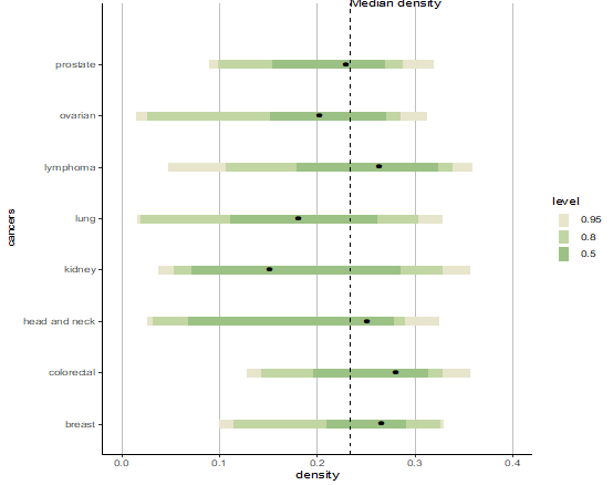 图1 情感表达网络在不同癌症中的密度箱线图,随时间变化而绘制。颜色差异代表断点的存在。