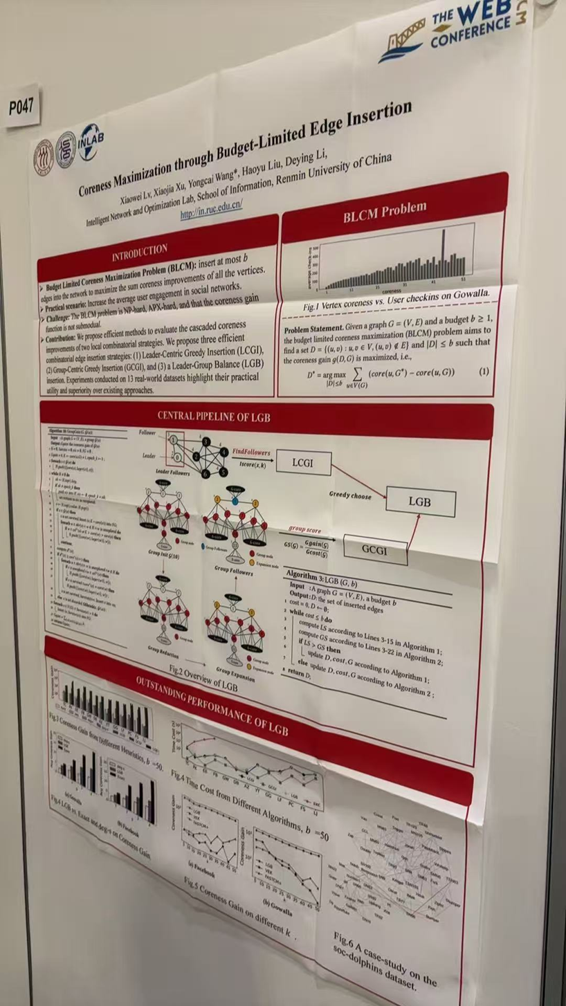 在导师王永才教授的指导下,吕筱玮专注于图结构挖掘的核心领域。他以第一作者身份发表于WWW 2025 Oral的论文《Coreness Maximization through Budget-Limited Edge Insertion》,针对社交网络中如何有限添加连接来最大化整体参与度的实际问题,提出将其形式化为一个基于图论的预算约束核度最大化问题。他证明了该问题的计算复杂性,并设计了一个高效的贪心算法框架,通过协同优化局部顶点与顶点组的增益来选择待插入的边。实验验证表明,他所提方法在核心度提升效果上显著优于基线算法,且保持了较高的运行效率。