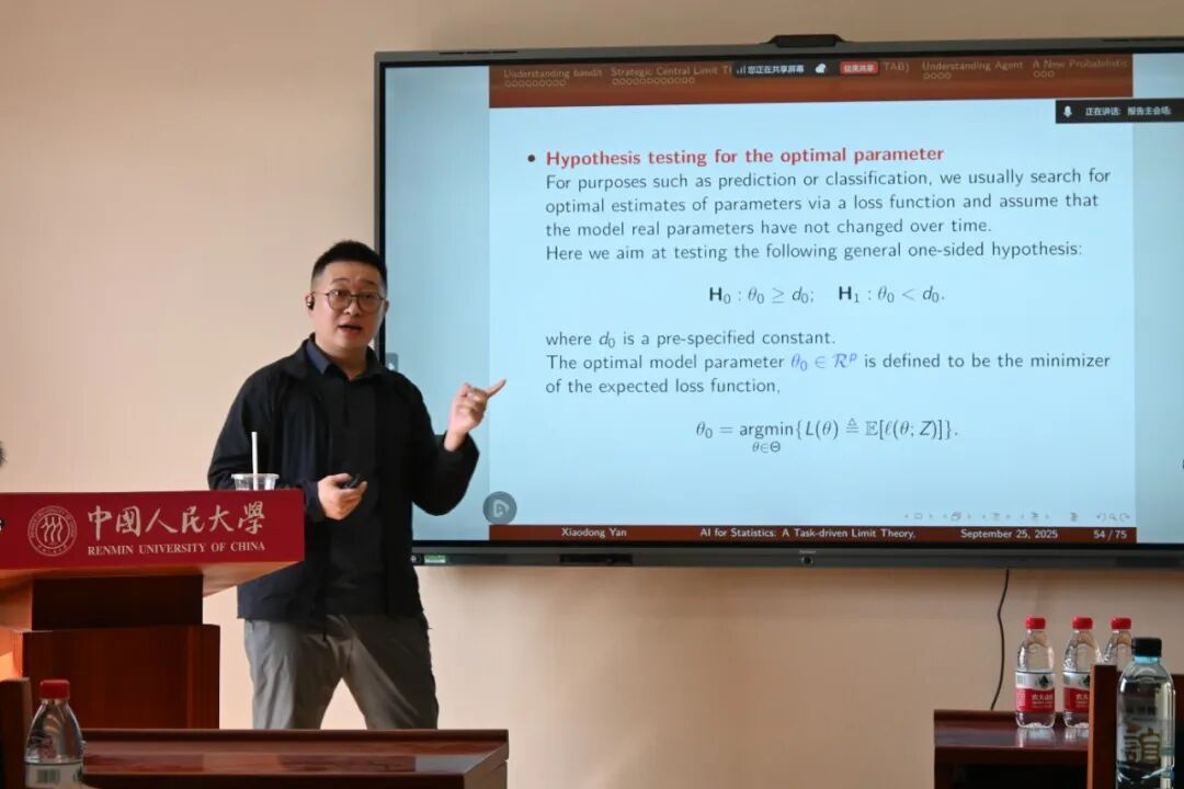 2025年9月26日上午,西安交通大学严晓东教授在中国人民大学开展了主题为“AI for Statistics: A Task-driven Limit Theory, New Statistical Inference and Some Application”的学术讲座。讲座由统计与大数据研究院杨光宇助理教授主持,现场同时开设了线上分会场。