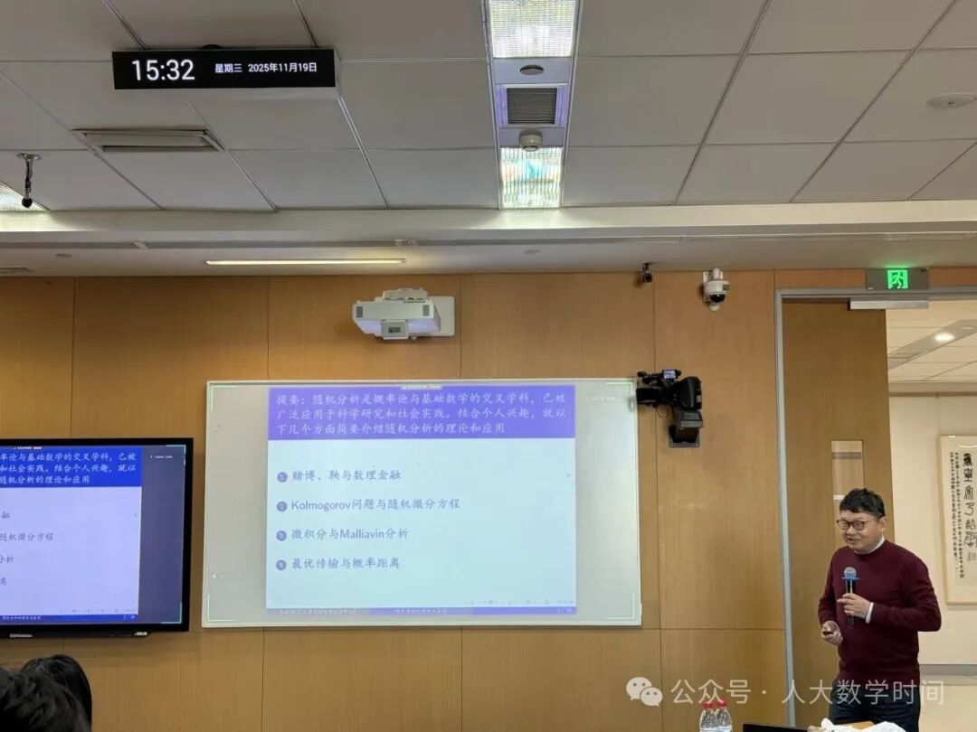 2025年11月19日15:30,在中国人民大学立德楼603教室,第三十四期“人大数学时间”活动成功举行。本期活动聚焦概率论与随机分析等前沿问题,特别邀请了天津大学王凤雨教授,以《关于随机分析的理论与应用》为主题,开展报告及前沿问题研讨,吸引了线上线下众多数学爱好者与专业人士参与。活动由统计与大数据研究院许王莉教授主持,现场学术氛围浓厚。