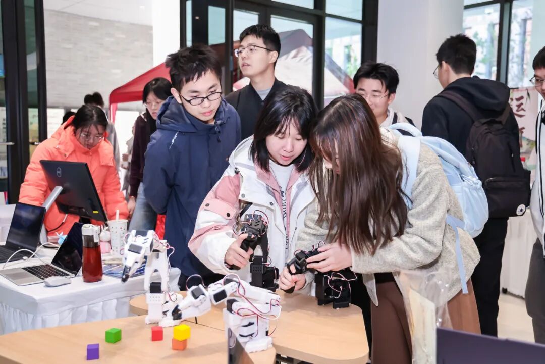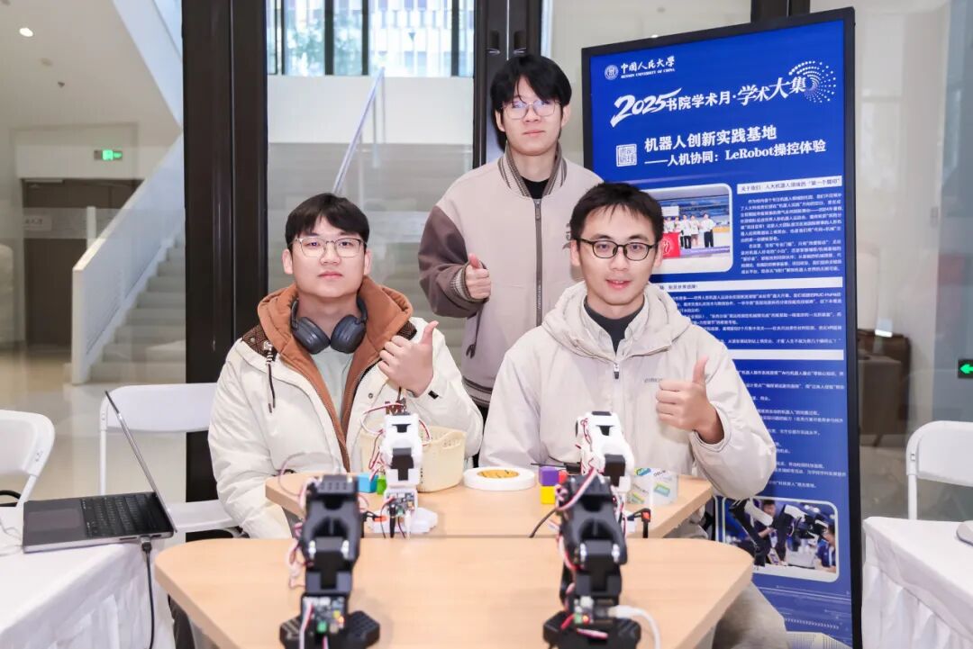 作为校内首个专注机器人领域并在国际赛事斩获亚军的团队,来自机器人创新实践基地的赵艺涵、沈海涛和黄浩洋三位成员携LeRobot机械臂亮相学术大集。黄浩洋现场讲解其操控原理,“通过摇动主臂,从臂可以一比一的对主臂动作进行复制,从而在不直接接触的情况下完成任务”。现场参与氛围热烈,同学们通过亲手操作主臂使从臂完成兼具趣味性和挑战性的游戏任务,不仅直观认识了机械臂的基本机械构造、运动学原理及控制方法,更深刻地感受到机器人技术在自动化、遥操作等领域的核心应用与巨大潜力。