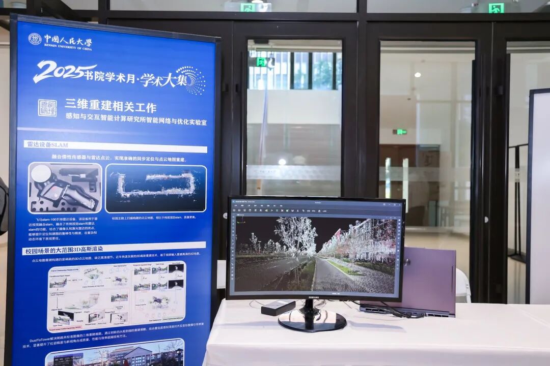 在三维重建展区,参观者被精细逼真的通州校区校园三维模型所吸引。来自感知与交互智能计算研究所智能网络与优化实验室的王徐笙和刘帅同学在现场展示了雷达视觉融合SLAM设备与3D高斯渲染技术,利用点云重建与深度优化算法,实现高精度、可漫游的三维空间重建。据团队成员介绍,他们研发的DustToTower系统突破了传统三维重建的稀疏与不稳定问题,通过置信度感知深度对齐与图像修复技术,显著提升了位姿精度与视觉效果。这项研究为未来的虚拟校园、智慧城市等应用提供了强大支撑。