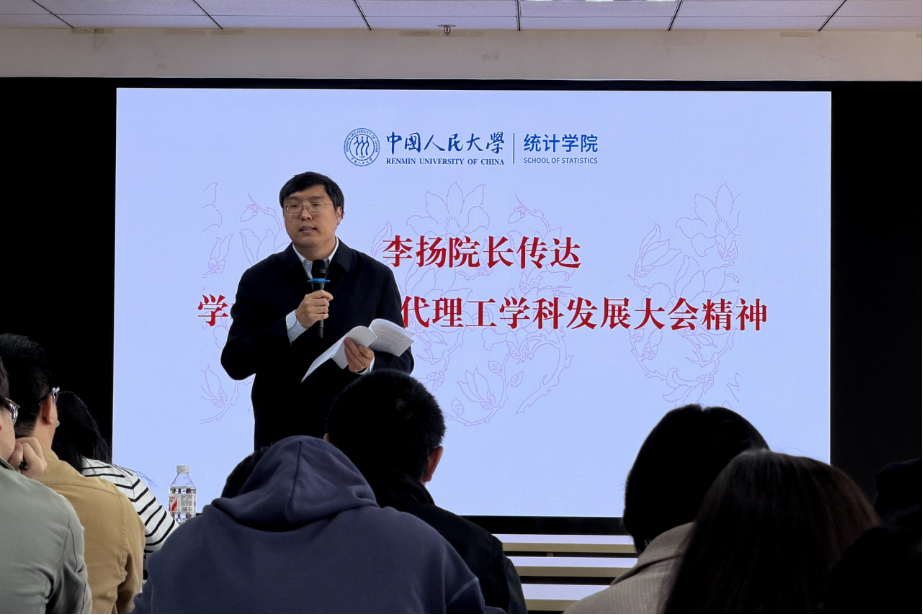李扬传达中国人民大学首次新时代理工学科发展大会会议精神。会议聚焦面向2037建校百年的理工学科发展,系统凝练了战略目标、核心任务、重大工程及实现路径,旨在进一步凝聚全校力量,系统谋划、全面部署、统筹推进新质理工学科发展。李扬强调,学院将积极响应学校双校区战略布局,以务实举措推动学科内涵式发展,奋力建设中国特色、世界一流的统计学科。同时,他介绍了教师考勤、因私出国(境)管理、绩效方案等制度调整等事项,号召全体教职工扎根教学科研管理工作一线,勇于承担急难险重任务,激发干事创业的主动性与创造性。