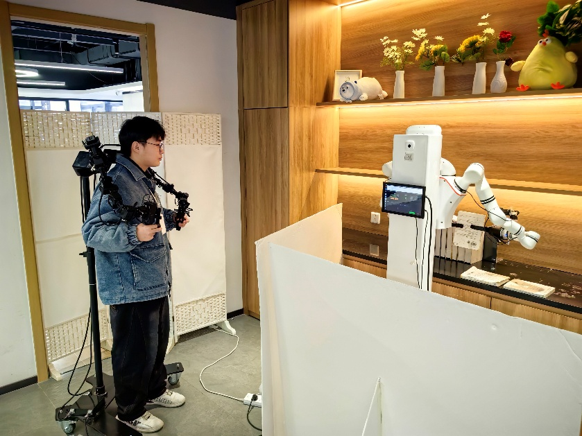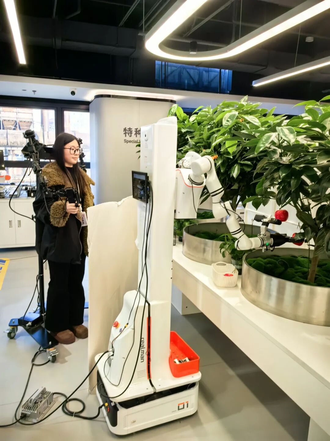 在训练中心内,技术人员通过示教机械臂引导目标机械臂重复完成指定动作,系统后台同步记录动作轨迹、关节角度、施力大小、执行时序等多维参数。这一以“人机对齐”为核心的数据采集方式,是当前高精度动作建模与控制算法训练的重要基础。通过对人类操作行为的结构化拆解与参数化记录,系统不断积累高质量训练数据。研究员在现场观察中深刻体会到,具身智能的“智能性”并非源于单一算法突破,而是建立在长期、持续、高质量数据积累之上的系统工程。正是这些看似重复、却高度精细的数据采集过程,支撑着机器人动作从“可执行”向“自然、稳定、安全”演进,也为后续模型泛化与跨场景应用奠定基础。