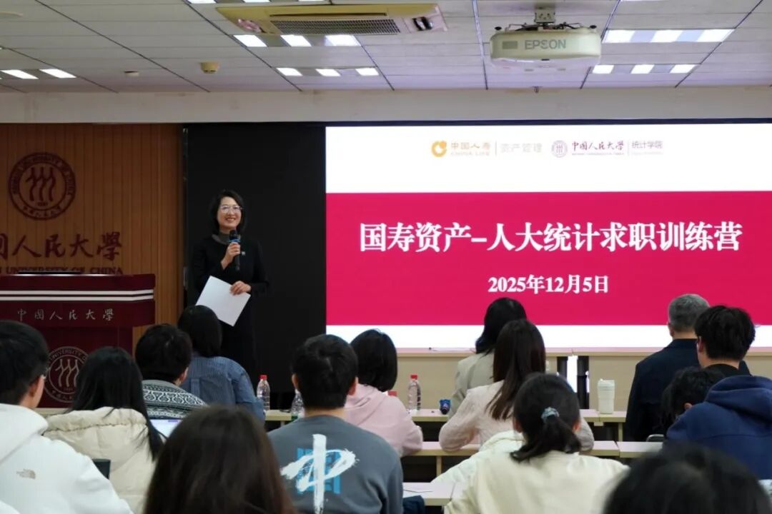 12月5日下午,国寿资产-人大统计“求职训练营”活动在中国人民大学举行。中国人寿资产管理有限公司党委组织部部长、人力资源部总经理张敬梅,资产配置部/国寿即客户部业务董事付倩,人力资源部(党委组织部)员工管理处高级主管管小宁作为特邀嘉宾出席;中国人民大学统计学院党委书记黄一顺,统计学院党委副书记、纪委书记金驰华出席活动。来自统计学院、财政金融学院、信息学院、商学院、高瓴人工智能学院等全校本硕博学生约50人参加活动。活动由金驰华主持。