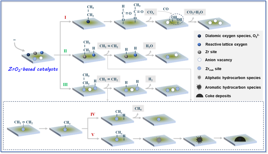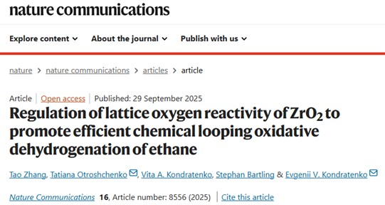 近日,中国人民大学化学与生命资源学院张涛团队与德国莱布尼茨催化研究所研究人员合作,在乙烷化学链氧化脱氢研究中取得重要进展。研究团队开发了一种结构可控、性能优异的ZrO2基催化剂体系,通过过渡金属掺杂与晶面调控,实现了对晶格氧数量及活性的精确调节。该体系在乙烯时空收率上显著优于已报道的催化剂,并表现出优异的反应稳定性和抗积碳性能。该研究成果以题为“Regulation of lattice oxygen reactivity of ZrO₂ to promote efficient chemical looping oxidative dehydrogenation of ethane”发表于国际顶级期刊《Nature Communications》。张涛副教授为论文第一作者,中国人民大学为第一完成单位。
