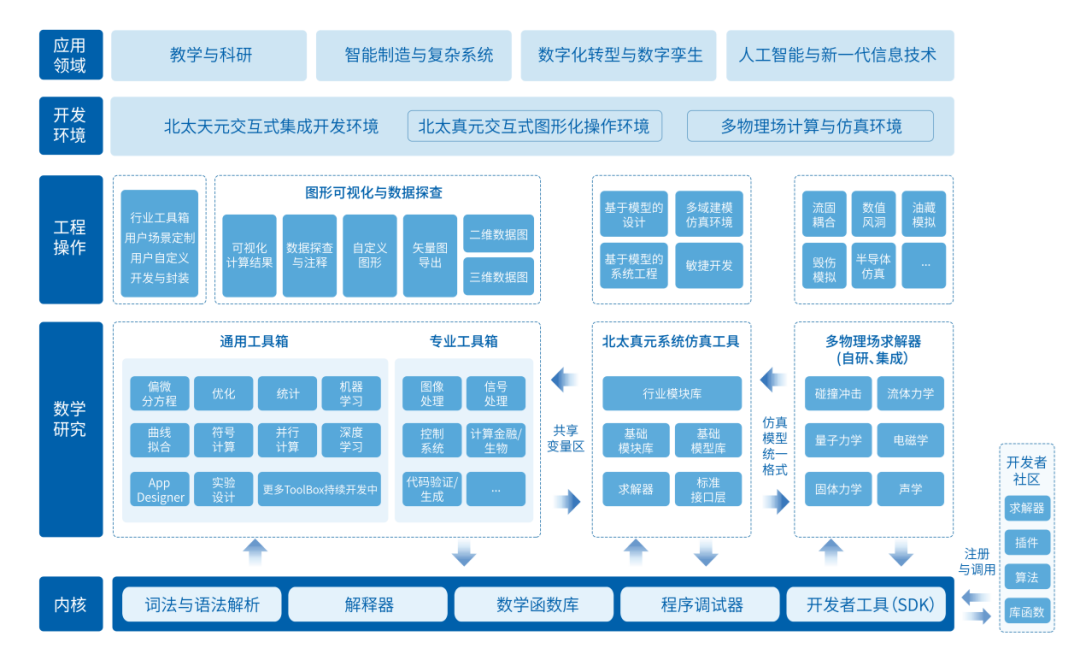 北京大学数学科学学院科研团队聚焦科学计算软件核心难题,依托该院在数值计算领域的深厚积累,高质量完成北太天元的研发。作为我国首款内核完全自主可控的通用型科学计算与系统仿真软件,北太天元采用自主构建的非开源技术路线,涵盖语言解析、编程框架、核心数学函数库等关键共性技术,在语言编程、科学计算、数据分析与图形可视化等方面具备强大的综合能力,已形成覆盖数据建模、数值计算、仿真分析与预测评估的完整技术体系。目前,该项目提交了30余件专利申请,7件获得授权。